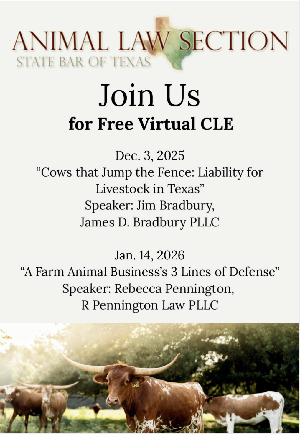 South Texas College of Law offers courses covering animal welfare, animal rights, and management of wildlife resources as well as student internships relating to animal law. For more information about the animal law program at STCL or about ALS, contact Professor Fran Ortiz at fortiz@stcl.edu.
